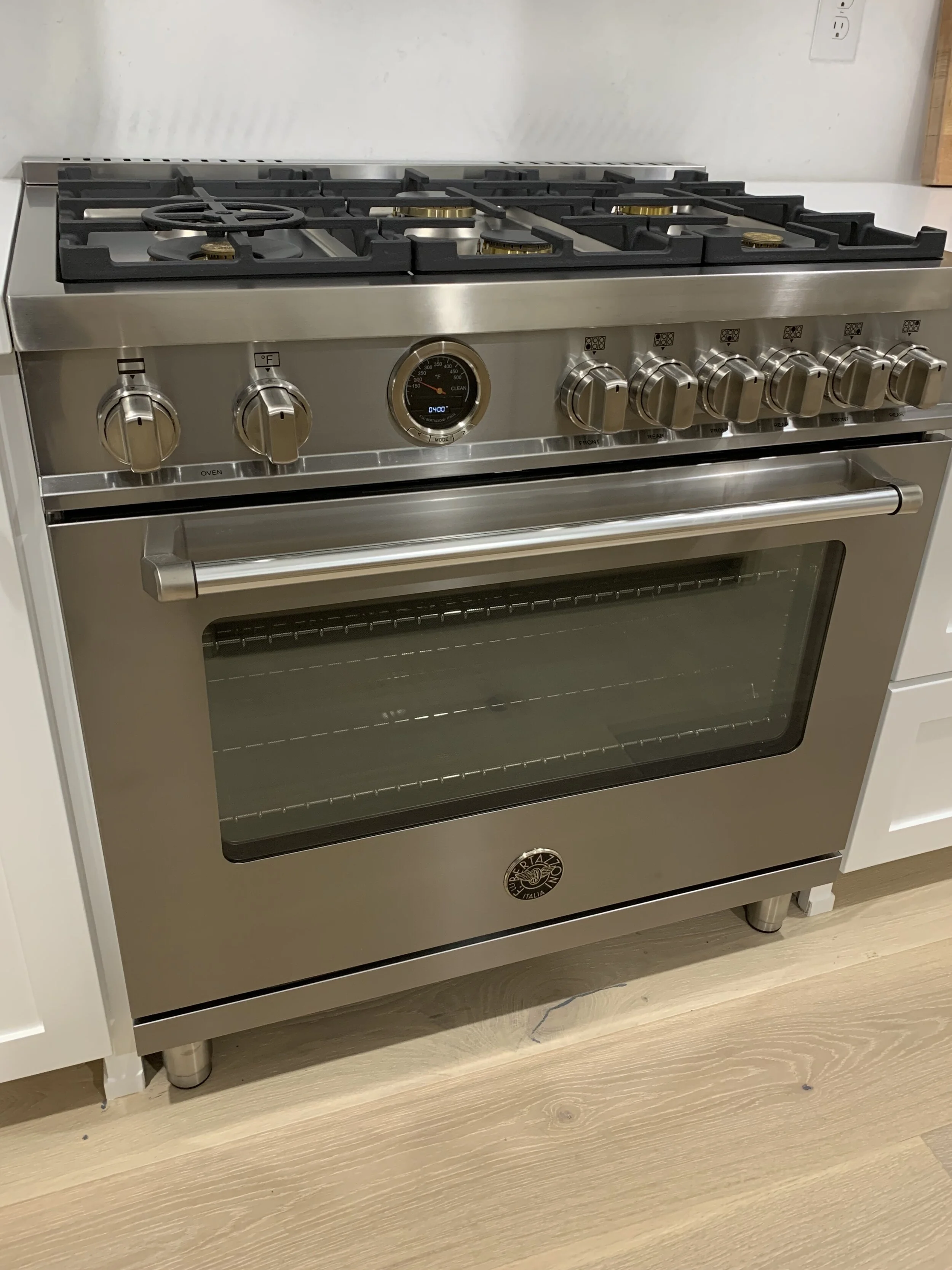 I have cooked with an electric cooktop for as long as I can remember. Ours had a smooth surface, and it was so easy to keep clean. Since we were eliminating the double ovens, and doing a drawer microwave, a free-standing range was the perfect space-saving solution. After deciding on a free-standing range, now it's time to determine what brand will work for our space. After looking at almost every brand, the Bertazzoni range had a lower profile and didn't protrude out from the countertop as much as some of the other brands, so we decided to go with the 36" dual fuel gas range.