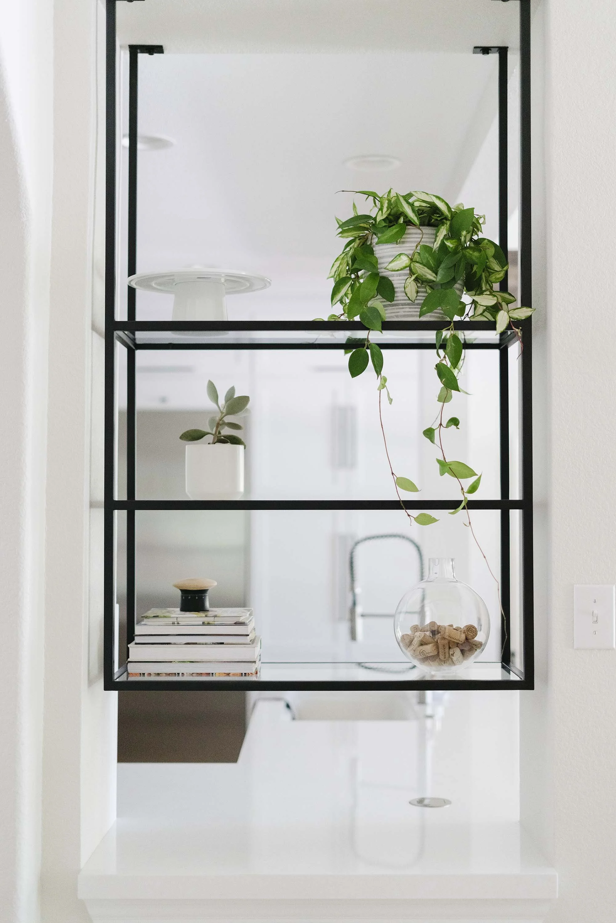 This hanging metal shelf is probably one of my favorite design details. I wanted something in this space that added a little something without making the kitchen feel closed-in. For this shelf, we used 3/4” square steel and tempered glass for the shelves. The creation is something I had in my head, and the fabrication is my husband. He worked hard on this project, and I’m so happy with how it turned out. This was on the list as a future project, but since we were in the middle of a Pandemic, his work schedule allowed him to be at home with some extra time on his hands.